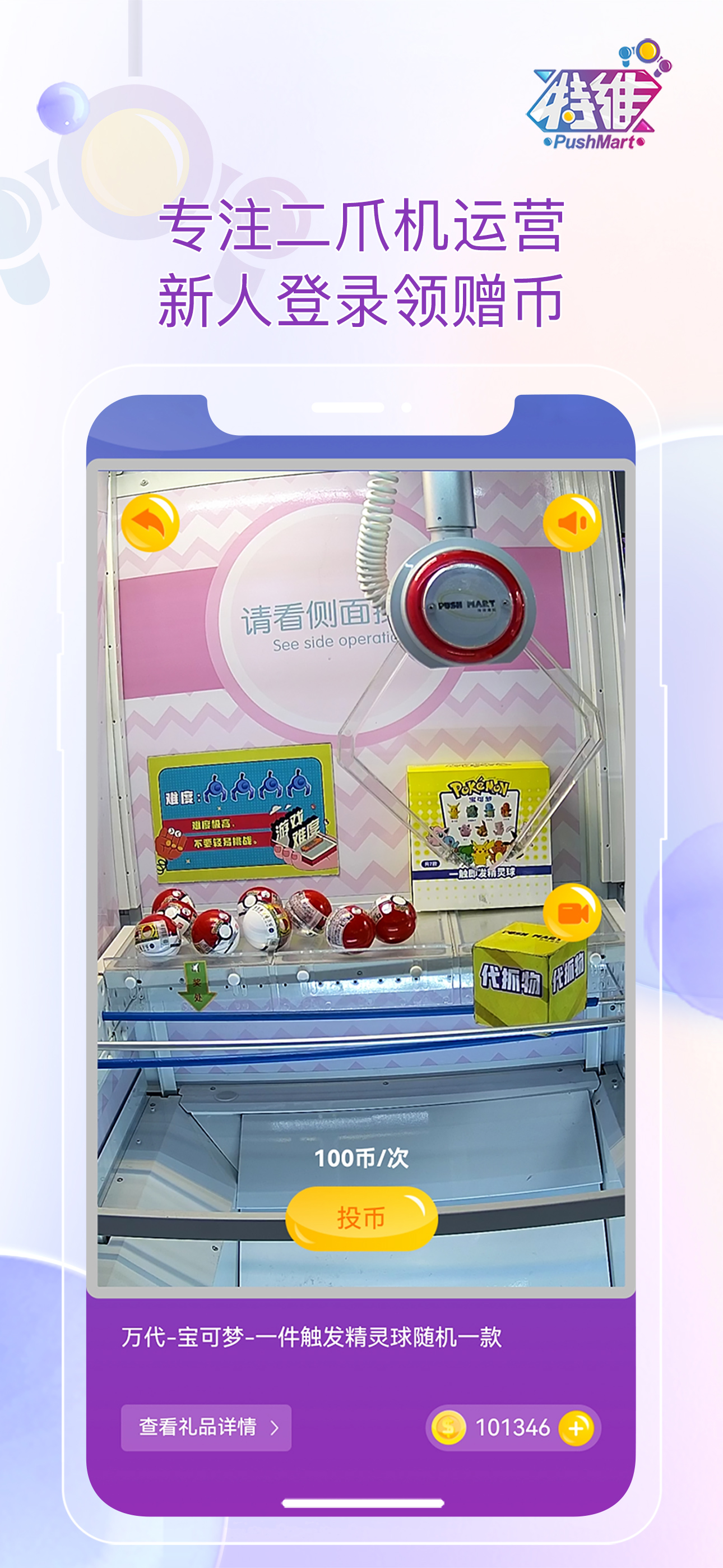 特维潮玩是由大连特维潮玩动漫科技有限公司研发的一款通过手机在线畅玩线下电玩城里各类游戏机台的软件。以二爪娃娃机为主营方向,结合了各类新奇有趣的抓娃娃玩法及高端潮玩礼品。