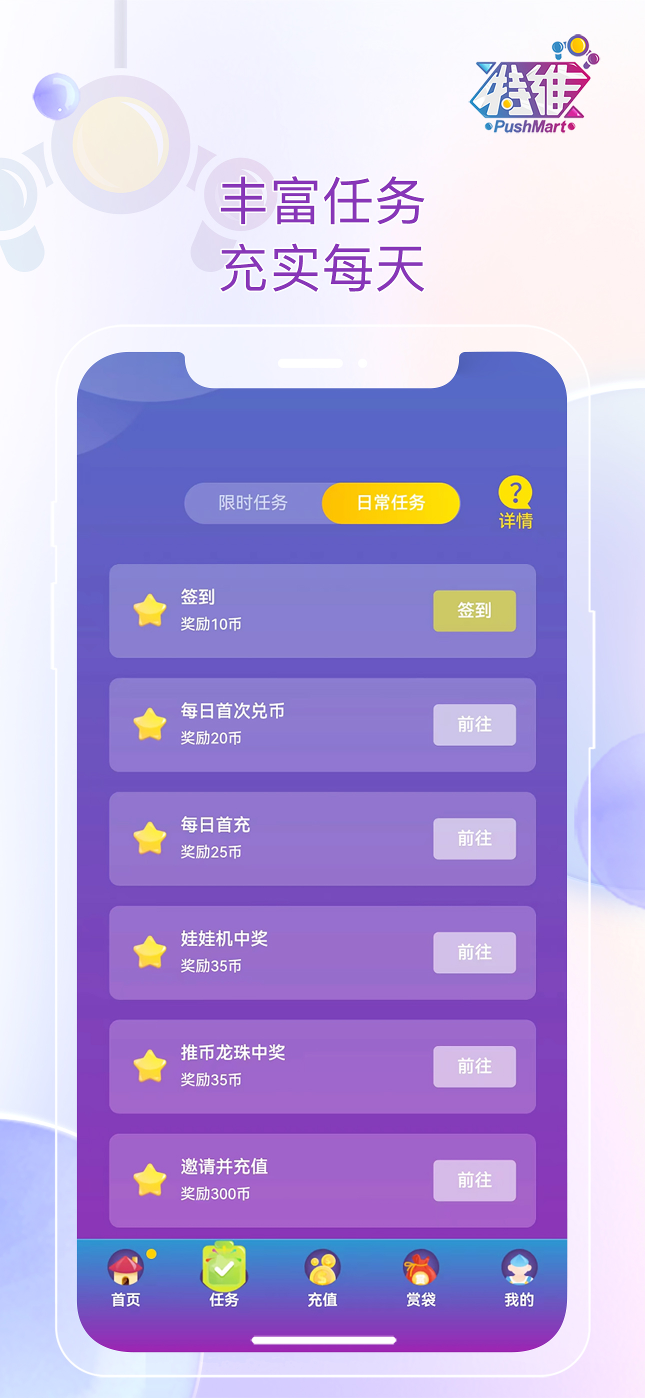 大连特维潮玩动漫科技有限公司典型属微创型企业,公司人员规模小于50人,创立于2021年。公司办公地址坐落于美丽的海滨城市大连,一直深耕在年轻人的电子游艺娱乐行业。公司当前的主营业务是经营手机抓娃娃app“Pushmart”。公司的企业愿景是“快乐陪伴-Happy Accompany”。“更新颖、刺激的游戏玩法;更优质、合理的礼品选择;更贴心、人性化的实时服务”的企业使命驱动着特维人在娱乐行业中匠心深造不断向前。
